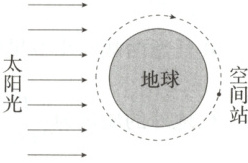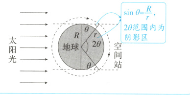 空间站绕地球做匀速圆周运动,空间站经历一次日落到日出的时间内,空间站在地球背面,与地心的连线转过的角度为$ 2\theta。$