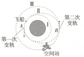 4.(2025 浙江温州期中) 2025 年 7 月 15 日,搭载天舟九号货运飞船的长征七号遥十运载火箭,在我国文昌航天发射场点火发射。飞船入轨后顺利完成状态设置,成功对接于空间站天和核心舱后向端口。其运动轨迹简化如图所示:飞船从预定轨道Ⅰ的 $A$ 点第一次变轨进入椭圆轨道Ⅱ,到达椭圆轨道的远地点 $B$ 时,再次变轨进入空间站的运行轨道Ⅲ并做匀速圆周运动,与空间站实现对接。假设轨道Ⅰ和Ⅲ都近似为圆轨道,不计飞船质量的变化,地球半径为 6 400 km,地球表面的重力加速度 $g$ 为 10 m/s²,下列说法正确的是