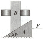 5.(2025 江苏南通海安高级中学月考 ) 如图为某种机械装置,物块 $B$ 放置在两固定挡板中间,物块 $B$ 和木楔 $A$ 的质量均为 $m$,木楔倾角为 $30°$,所有接触面均光滑。现用水平恒力 $F$ 推动木楔 $A$ 水平向左运动,物块 $B$ 被顶起。已知重力加速度为 $g$,则 (