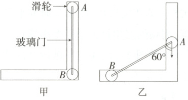 3.☉创新题 ☉新情境 (2025 江苏镇江、徐州七校期中联考 )直角侧移门结构可简化成图甲 (俯视 )。玻璃门的两端滑轮 $A$、$B$ 通过一根可自由转动的轻杆连接,滑轮可沿直角导轨自由滑动 (滑轮视为质点 )。玻璃门的宽度为 $L = 1 m$。关门时,拉住把手使滑轮 $A$ 从初始位置由静止开始做加速度为 $1 m/s^2$ 的匀加速运动,当 $A$ 到达图乙位置时,滑轮 $B$ 的速度大小为 (