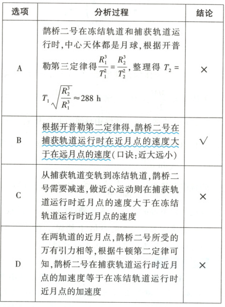 9. (2024 安徽,5) 2024 年 3 月 20 日,我国探月工程四期鹊桥二号中继星成功发射升空。当抵达距离月球表面某高度时,鹊桥二号开始进行近月制动,并顺利进入捕获轨道运行,如图所示,轨道的半长轴约为 $51900 km$。后经多次轨道调整,进入冻结轨道运行,轨道的半长轴约为 $9900 km$,周期约为 $24 h$。则鹊桥二号在捕获轨道运行时 (