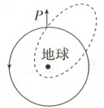 10 (2024 湖北,4) 太空碎片会对航天器带来危害。设空间站在地球附近沿逆时针方向做匀速圆周运动,如图中实线所示。为了避开碎片,空间站在 $P$ 点向图中箭头所指径向方向极短时间喷射气体$^{[1]}$,使空间站获得一定的反冲速度,从而实现变轨。变轨后的轨道如图中虚线所示,其半长轴大于原轨道半径。则(