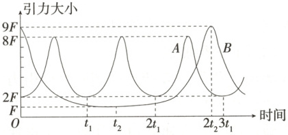 6. (2025 江苏扬州中学期中) 某行星的卫星 $A$、$B$ 绕以该行星为焦点的椭圆轨道运行,作用于 $A$、$B$ 的引力随时间的变化如图所示,其中$t_2 = \sqrt{2} t_1$,行星到卫星 $A$、$B$ 轨道上点的距离分别记为$r_A$、$r_B$,假设 $A$、$B$ 只受到行星的引力,下列说法正确的是 (