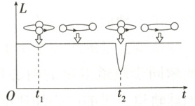 5. (2025 浙江温州模拟) “食双星” 是特殊的双星系统,由两颗亮度不同的恒星组成,它们在万有引力作用下绕连线上某点做匀速圆周运动,且轨道平面与观测者视线方向几乎平行。由于两颗恒星相互遮挡,造成观测者观察到双星的亮度 $L$ 发生周期性变化,如图所示。若较亮的恒星和较暗的恒星轨道半径分别为 $r_1$ 和 $r_2$($r_1$ 和 $r_2$ 远小于该双星系统到观测者的距离),不计其他星体对两恒星的影响。下列说法正确的是 (