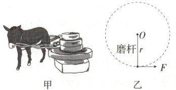 6.(2025江苏苏州震泽中学月考)早在两千多年前,我国就发明了汉石磨盘,它是一种可使谷物脱壳、粉碎的加工工具,凝聚着人类的高度智慧。二十世纪六七十年代我国有些地方利用驴拉磨把谷物磨成面粉,图甲为驴拉磨的场景。驴拉磨可以看作匀速圆周运动,假设驴对磨杆的拉力方向时刻与磨杆垂直,图乙为其简化图,驴对磨杆末端的平均拉力大小$F = 500 N$,磨杆长度$r = 2 m$,驴拉磨转动一周的时间为$10 s$。则下列说法正确的是 (