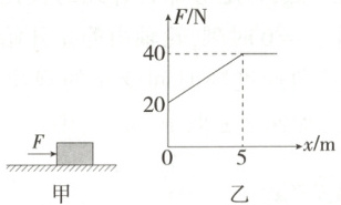 9.(2025吉林长春期中)如图甲所示,在水平地面上放置一木块,其质量$m = 10 kg$,木块在水平推力$F$作用下运动,推力$F$的大小随位移$x$变化的图像如图乙所示。已知木块与地面间的动摩擦因数$\mu = 0.2$,重力加速度$g$取$10 m/s^2$,最大静摩擦力等于滑动摩擦力,下列说法正确的是 (