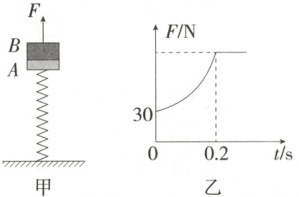 10.(2025广西南宁二中、柳铁一中联考)如图甲所示,轻弹簧一端固定在地面上,一端与质量为$m_{ A} = 1 kg$的物块$A$相连,物块$B$叠放在物块$A$上,但不与$A$相连,$m_{ B} = 2 kg$。开始时整个系统处于静止状态,从$t = 0$时刻开始,对$B$施加一竖直向上的力$F$,使物块$B$做匀加速直线运动。力$F$随时间$t$变化的规律如图乙所示,取重力加速度$g = 10 m/s^2$,下列说法不正确的是 (