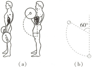 2.(2024 广东茂名月考)如图(a)所示,运动员做杠铃弯举训练,保持肘关节位置不变,前臂从竖直位置弯举到与上臂夹角为 $60°$ 的位置,完成一次弯举,杠铃运动轨迹如图(b)。已知杠铃总质量为 $20\ kg$,掌心到肘关节的距离约为 $30\ cm$,此过程中运动员克服杠铃重力做功约为(