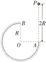 6.(2025 江苏苏州月考)如图所示,在竖直平面内有一个半径为$R$的圆弧轨道,半径$OA$水平、$OB$竖直,一个质量为$m$的小球(可看作质点)自$A$正上方$P$点由静止开始自由下落,小球沿轨道到达最高点$B$时恰好对轨道没有压力,已知$AP = 2R$,重力加速度为$g$,则小球从$P$到$B$的运动过程中,克服摩擦力做的功为 (