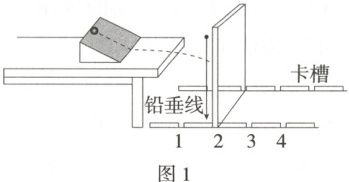 4. (2025 安徽鼎尖联盟期中)某实验小组设计了探究平抛运动竖直分运动特点的实验,装置如图1所示。把白纸和复写纸叠放后固定在竖直木板上,在桌面上固定一个斜面,斜面的底边与桌子边缘及木板平行。将木板插入自制水平槽中,槽口间距相等用以改变木板到桌边的距离,让小球从斜面顶端同一位置滚下,通过碰撞复写纸,在白纸上记录小球的落点,重力加速度为$ g $。