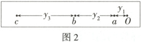 (4) 选取落点清晰的白纸如图2所示,用刻度尺分别测出相邻两点之间的距离记为$ y_1 $、$ y_2 $、$ y_3 $及相邻槽口间的距离记为$ x $,若$ y_1 : y_2 : y_3 = $