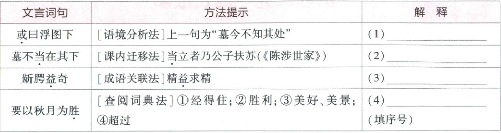 解析 (1)上一句“墓今不知其处”意为:如今吴王的墓穴已不知道确切位置了。据此可知“或曰浮图下”是对吴王墓位置的推测,意为:有人说在佛塔的下面。“或”意为“有人”。(2)“当立者乃公子扶苏”意为:应当被立为皇帝的是公子扶苏。“当”意为“应当”。(3)精益求精:(学术、技术、作品、产品等)好了还求更好。“益”意为“更加”。(4)将词典中的义项一一代入这句话,可发现③最为合适,此时可推测句意为:主要以秋月为美景。故选③。