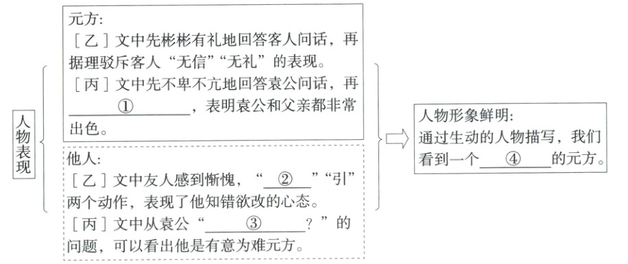 解析 ①阅读[丙]文,首先理解元方与袁公对话的语境;然后关注元方回答袁公第二个问题的内容,即“周公、孔子……孔子亦不师周公”。可以看出,元方在回答袁公第二个问题时并未直接给出答案,而是通过周公和孔子的例子,巧妙说明袁公和父亲同样出色,保全了双方的颜面。②阅读[乙]文,首先找到描写友人惭愧的相关语句,即“友人惭,下车引之”;然后找出描写友人动作的相关词语,即可确定答案为“下车”。③研读[丙]文,重点关注袁公的提问内容。其中“不知卿家君法孤,孤法卿父?”这个问题对于元方来说比较难回答,因为无论回答父亲效法袁公,还是袁公效法父亲,都可能会带来一些不好的影响,要么贬低父亲,要么冒犯袁公。所以从这个问题可以明显看出袁公是有意为难元方的。④在[乙]文中,元方面对客人的询问,彬彬有礼地回答,并且能针对客人“无信”“无礼”的行为进行有力的驳斥,这体现了他懂礼识义、能言善辩的特点;在[丙]文中,元方面对袁公的提问,不卑不亢地回答,尤其是在面对袁公有意为难的问题时,能够巧妙地以周公和孔子的例子应对,这体现了他聪明机智、不卑不亢的特点。综合作答即可。