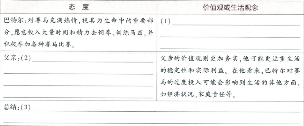 3.巴特尔对赛马的态度与他父亲对赛马(或巴特尔养马行为)的态度形成了鲜明的对比。请具体分析两者态度的差异,并探讨这种差异背后所反映出的不同价值观或生活观念。(6分)