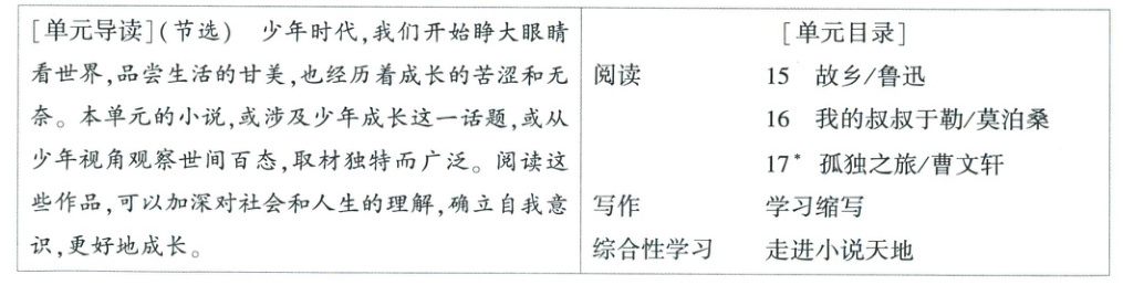 4.答案 (示例)合适。本单元小说或涉及少年成长这一话题,或从少年视角观察世间百态。《故乡》中的闰土,从少年英雄到沧桑农夫,反映了时代悲剧和个人成长困境,映照出底层民众的悲惨命运;《我的叔叔于勒》从若瑟夫视角观察菲利普夫妇对于勒的态度转变,体现了金钱对亲情的异化;《孤独之旅》中的杜小康,在放鸭之旅中,成长和孤独结伴而行。选文通过叙述巴特尔与马的故事,展现了一个少年在成长过程中的迷茫、追求、努力与释放,与单元主题高度契合。巴特尔对马的痴迷、对现状的不满、对龙云和虎风的精心饲养以及最终的情感释放,都反映了少年在成长过程中的心路历程。本文以蒙古草原为背景,以人与马的关系为线索,讲述了一个富有地域特色和民族特色的故事。这种独特的取材不仅丰富了单元的阅读内容,还能拓宽学生的视野,让他们了解到不同文化背景下的少年成长故事。