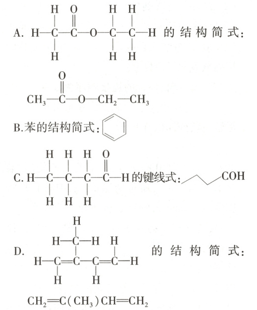 7.A 乙烯的结构简式为CH₂=CH₂,故A错误;丙炔中含有碳碳三键,键线式为≡— ,故B正确;1个三氯甲烷分子中有3个氯原子、1个氢原子、1个碳原子,且氯原子半径>碳原子半径>氢原子半径,故C正确;甲基是CH₄失去1个H原子后的基团,其电子式为H ·C· H H,故D正确。