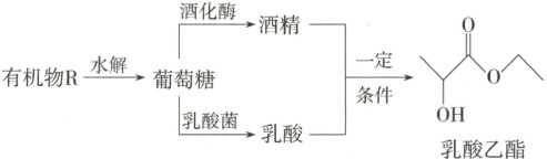 15.D 有机物R可能为麦芽糖、淀粉、纤维素等,麦芽糖不属于高分子,A错误;酒精和乳酸发生酯化反应,酯化反应的条件为浓硫酸、加热,B错误;乳酸乙酯在烧碱溶液中水解生成$CH_{3}CH(OH)COONa$和$CH_{3}CH_{2}OH$,分子式分别为$C_{3}H_{5}O_{3}Na$和$C_{2}H_{6}O$,C错误;乳酸乙酯中的官能团为羟基和酯基,与其具有相同官能团的同分异构体可看作分子式为$C_{5}H_{10}O_{2}$的酯中一个烃基氢原子被羟基取代,分子式为$C_{5}H_{10}O_{2}$的酯有9种,则与乳酸乙酯具有相同官能团的同分异构体的种数大于8种,D正确。
