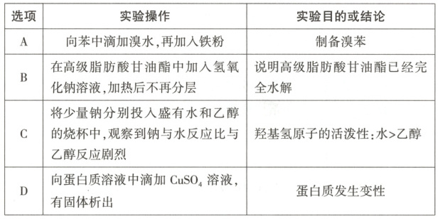 13.A 苯与溴水不反应,A项错误;在高级脂肪酸甘油酯中加入氢氧化钠溶液,高级脂肪酸甘油酯发生水解,生成高级脂肪酸钠和甘油,二者均溶于水,加热后不再分层,表明没有高级脂肪酸甘油酯剩余,水解完全,B项正确;金属钠与水反应剧烈,金属钠与乙醇反应比较缓慢,这说明羟基氢原子的活泼性:水>乙醇,C项正确;$CuSO_{4}$属于重金属盐,其能使蛋白质变性,D项正确。