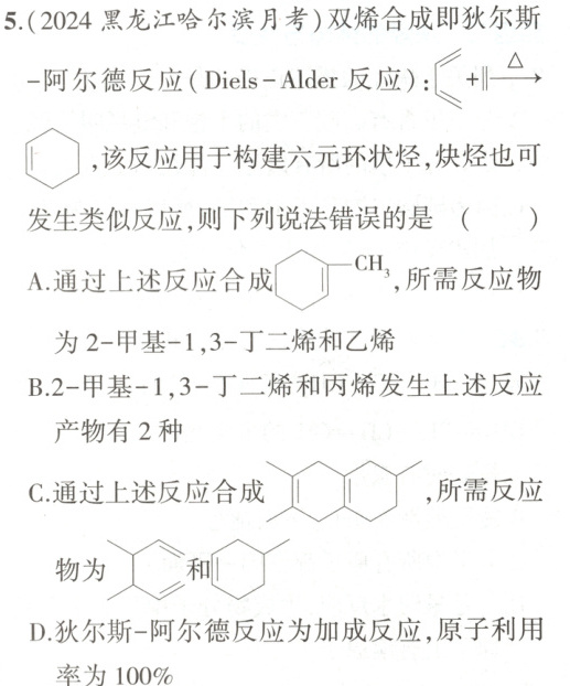 ,故C 错误;狄尔斯−阿尔德反应为加成反应,没有其他产物生成,则原子利用率为100%,故D正确。