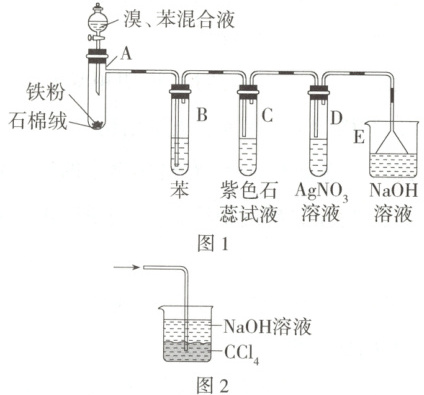 8.C 由实验装置图可知,装置A中液溴、苯在FeBr₃的催化下发生取代反应制备溴苯,装置B中盛有的苯用于吸收挥发出的溴蒸气,装置C、D用于检验溴化氢的生成(C中紫色石蕊试液慢慢变红、D中产生浅黄色沉淀),装置E用于吸收溴化氢(尾气处理)。装置C、D、E均具有防倒吸的作用,题图2所示装置也有防倒吸的作用,可以替代装置E,C项错误。