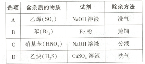 4.B 混合气体通过NaOH溶液时,SO₂和NaOH反应,而乙烯不反应,可达到除杂的目的,A正确;加入Fe粉会发生苯与Br₂的取代反应,达不到除杂的目的,B错误;HNO₃能和NaOH反应,而硝基苯不反应,又因为硝基苯不溶于水(密度大于水),可达到除杂的目的,C正确;H₂S能和CuSO₄反应:CuSO₄+H₂S=CuS↓+H₂SO₄,而乙炔不反应,可达到除杂的目的,D正确。
