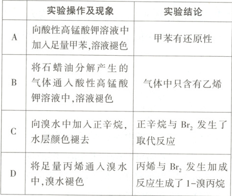 2.A 甲苯被酸性高锰酸钾溶液氧化,说明甲苯具有还原性,A正确;将石蜡油分解产生的气体通入酸性高锰酸钾溶液中,溶液褪色,只能说明该气体中含有不饱和烃,B错误;正辛烷将$\mathrm{Br_2}$从水中萃取出来而使水层褪色,$\mathrm{Br_2}$与正辛烷不反应,C错误;$\mathrm{Br_2}$与丙烯发生加成反应得到的产物为1,2 - 二溴丙烷,D错误。
