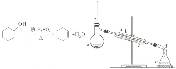 在 a 中加入 20 g 环己醇和少量碎瓷片,在搅拌下慢慢加入 1 mL 浓$H_2SO_4$;b