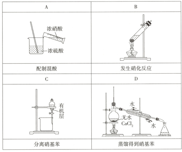 5.实验室制备硝基苯(密度为$1.45g· cm^{-3}$,不溶于水)时,经过配制混酸、发生硝化反应($50\sim60^{\circ}C$)、分离、蒸馏等步骤。下列能达到目的的是