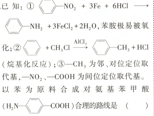 2.C 若苯先发生硝化反应,由于硝基是间位定位取代基,再引入甲基时会进入硝基的间位,故应先发生烷基化反应。得到的甲苯发生硝化反应,生成对硝基甲苯。对硝基甲苯先发生氧化反应,将甲基氧化为羧基;若先将硝基还原为氨基,则氧化甲基时氨基容易被氧化。所以合理路线为苯烷基化甲苯硝化对硝基甲苯氧化甲基对硝基苯甲酸还原硝基对氨基苯甲酸,C项正确。