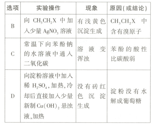 3.C 乙烯和挥发出的乙醇均能使酸性高锰酸钾溶液褪色,故无法证明有乙烯生成,A项错误;CH₃CH₂X不能与硝酸银溶液反应,B项错误;常温下苯酚钠溶于水,苯酚与水形成浊液,向苯酚钠的水溶液中通入二氧化碳,溶液变浑浊,说明生成了苯酚,根据“较强酸制较弱酸”可知,碳酸的酸性强于苯酚,C项正确;葡萄糖在碱性条件下与新制氢氧化铜悬浊液共热反应生成氧化亚铜砖红色沉淀,检验淀粉水解产物时,应先加入氢氧化钠溶液中和稀硫酸使溶液呈碱性,再加入新制氢氧化铜悬浊液,D项错误。