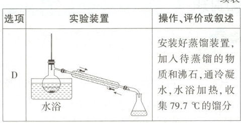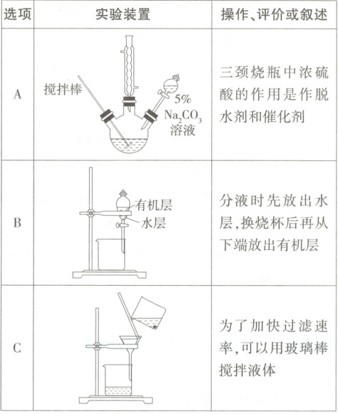 4.D 丙酸、甲醇和浓硫酸置于三颈烧瓶中发生酯化反应时,浓硫酸的作用是作催化剂和吸水剂,故A错误;丙酸甲酯不溶于水,密度小于水,加入饱和碳酸钠溶液后分层,水层在下层,分液时,下层液体从下口放出,上层液体从上口倒出,故B错误;过滤时用玻璃棒搅拌液体,可能会造成滤纸破损,故C错误;为使反应物受热均匀,可以采用水浴加热的方式,丙酸甲酯沸点为79.7℃,故应收集79.7℃的馏分,故D正确。