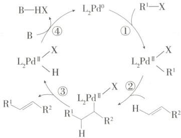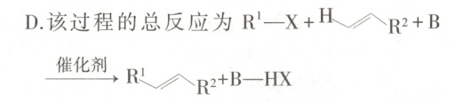 ,故B正确;结合题图可知反应②为加成反应,故C正确;由题图转化过程可知,环上物质代表催化剂参与反应的转化过程,入环箭头代表反应物,出环箭头代表生成物,该过程的总反应为$R¹—X + H₂C=CH—R²\overset{催化剂}{\longrightarrow}R¹—CH=CH—R² + B—HX,$故D正确。