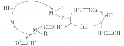 7.卤代烃与端基炔$(R'C≡CH)$催化偶联反应的一种机理如图所示。