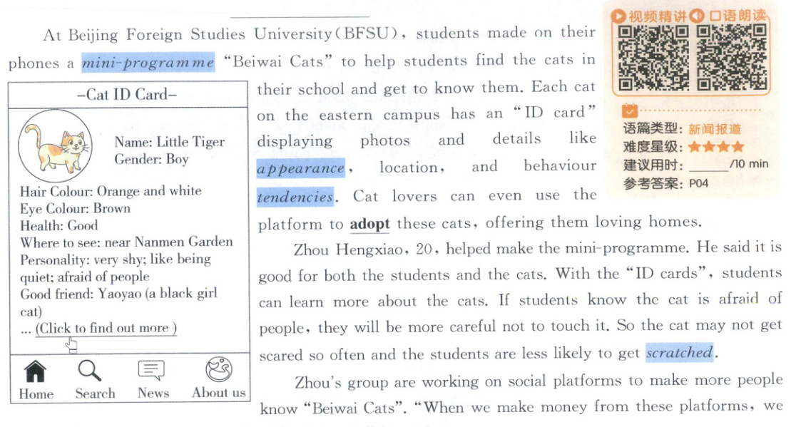 一、1.B 细节理解题。根据“students made on their phones a mini-programme ‘Beiwai Cats’ to help students find the cats in their school”可知,北外的学生通过手机使用一个小程序来找到学校的猫。故选B。