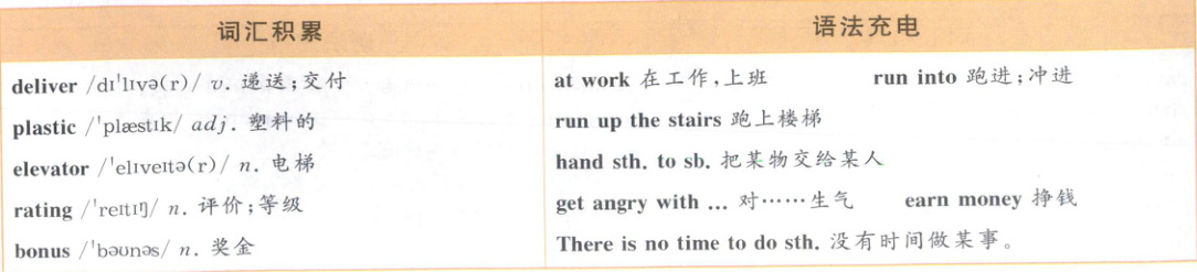 Lunch - delivery men usually start working at 10 a. m. 5. D a typical lunchtime rush, each of them has to deliver six orders in an hour. Guo sometimes has to deliver ten meals in an hour. “That's really difficult. If you 6. (/ə'raɪv/) late, you must say sorry,” he says. “If your customer gets 7. a with you and gives you a poor service rating, you may 8. l your job.”