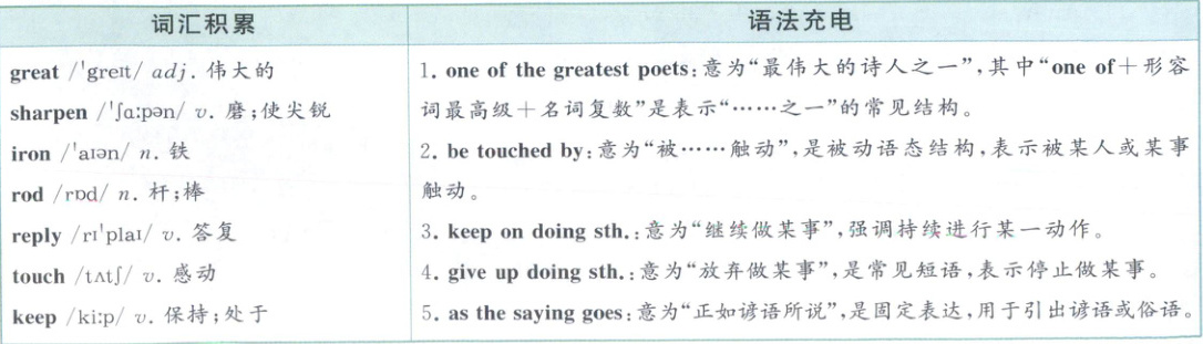 4. F 根据“Li Bai was touched by the old woman.”和“He went back home and kept on reading the book.”可知,他被老妇人感动了,决定努力学习,选项F“所以他决定努力学习。”符合语境。故选F。
