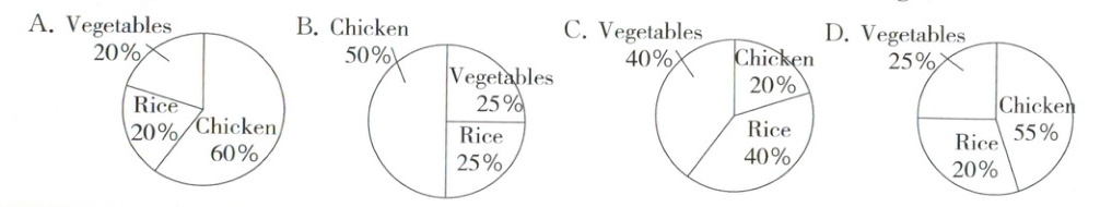 3. B 学科融合题。根据材料中的建议:肉不应超过餐食的一半(“However, meat should not be more than half of the meal.”);鱼对狗有益,可以每周提供两次鱼餐。没有提到蔬菜和米饭的具体比例限制,但需要保证整体营养均衡。分析选项:选项 A:鸡肉占 60%,超过了材料中建议的“肉不应超过一半”的比例,因此不符合建议。选项 B:鸡肉占 50%,刚好达到上限,符合建议;蔬菜和米饭各占 25%,整体比例较为均衡。选项 C:鸡肉占 20%,未超过一半,但蔬菜占 40%,比例过高,可能影响营养均衡;米饭占 40%,整体比例不太合理。选项 D:鸡肉占 55%,肉超过一半,不符合建议,因此正确答案应为选项 B。