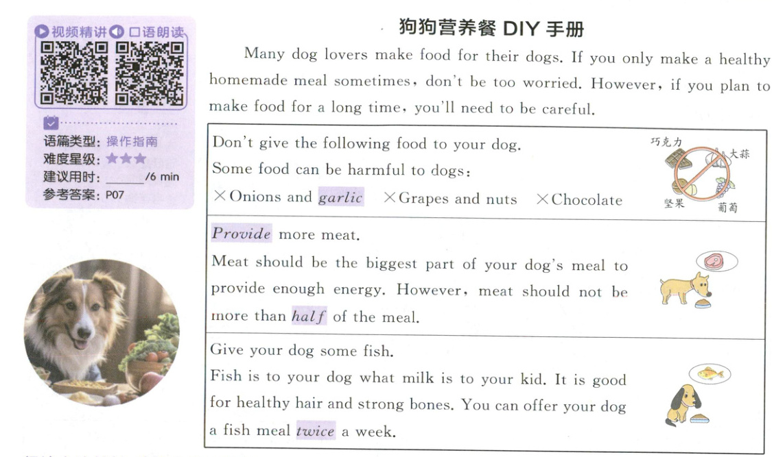 1. D 细节理解题。根据材料中“Provide more meat.”部分提到的“Meat should be the biggest part of your dog’s meal to provide enough energy.”可知,肉是狗餐食的主要部分,能为狗提供足够的能量。选项 D“Dogs need enough energy.”直接对应材料中的解释,因此是正确答案。