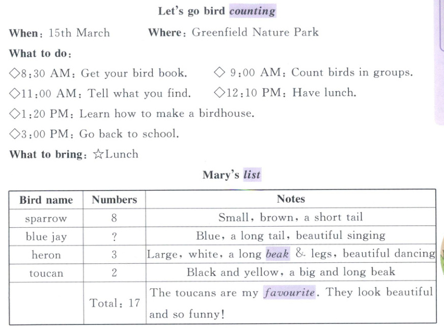 8.4 根据Mary的列表中“Total:17”以及给出的其他鸟类数量(8只麻雀、3只苍鹭、2只巨嘴鸟),计算得出蓝鸦的数量为4只,所以填“4”。