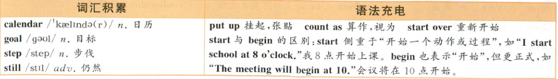 calendar /'kælɪndə(r)/ n. 日历 put up 挂起,张贴 count as 算作,视为 start over 重新开始