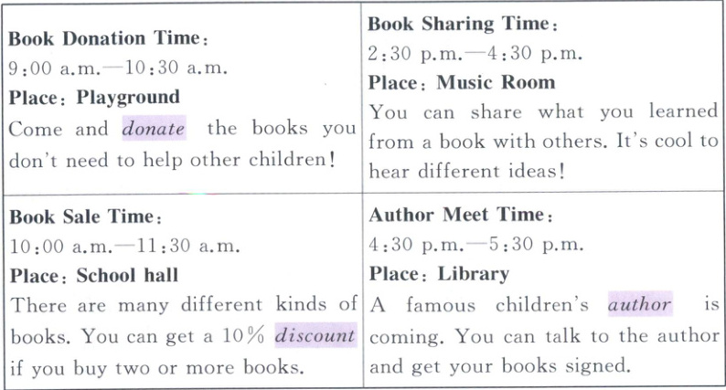 一、1.C 细节理解题。选项A:“You can get your books signed by the author at the Book Donation.”错误。签名活动是在“Author Meet”中,而不是“Book Donation”。选项B:“You can get a discount if you buy two books during the Author Meet.”错误。折扣是在“Book Sale”中提供的,而不是在“Author Meet”。选项C:“You can share what you learned from a book at the Book Sharing.”正确。文章中提到“You can share what you learned from a book with others.”,符合描述。选项D:“You can donate books to help other children during the Book Sale.”错误。捐赠书籍是在“Book Donation”中,而不是“Book Sale”。