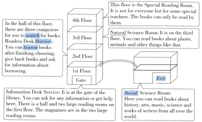 题目常涉及楼层关系(如“楼上/楼下”),需将文字描述与示意图结合理解。例如本题需判断“搜索书籍的楼层”在信息服务台的楼上(2 楼),需将“2nd Floor:three computers”与“1st Floor:Information Desk”关联。