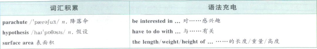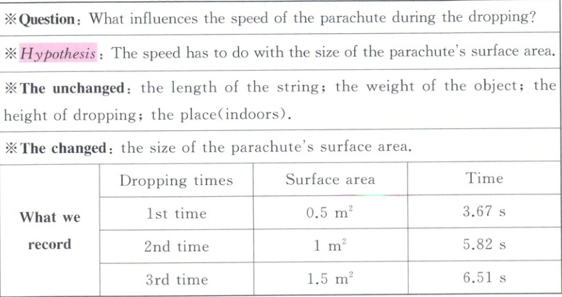 2. D 推理判断题。根据“The changed:the size of the parachute’s surface area.”可知本实验假设的内容为“降落伞的下降速度与其表面积有关”。从表面积不同的实验数据来看,表面积越大,下降时间越长,则速度越慢。换言之,降落伞的表面积影响其下降速度。故选D。