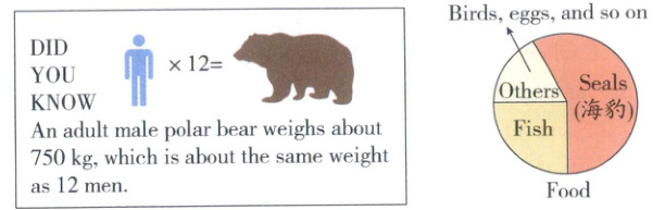 1. D 细节理解题。根据图表 Food 可知,扇形统计图中海豹占比最大,所以北极熊主要吃 Seals。故选 D。