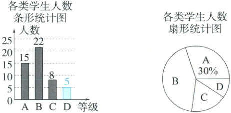 (2)D类学生的人数为$ 50 - 15 - 22 - 8 = 5 $(人),补全条形统计图如图所示.