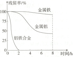 ②量取三份 50 mL 溶液甲,分别用金属铝、金属铁和铝铁合金在 45 ℃、稀有气体氛围中将溶液甲中的$NO_3^-$还原为$N_2$,溶液中$NO_3^-$的残留率(残留率=$\frac{起始浓度}{剩余浓度}$×100%)与反应时间的关系如图所示。