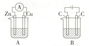 (2)锌比铜活泼,Zn是负极,发生氧化反应,电极反应式为Zn-2e⁻=Zn²⁺;Cu为正极,电极反应式为Cu²⁺+2e⁻=Cu;A中总反应的离子方程式为Zn+Cu²⁺=Zn²⁺+Cu。