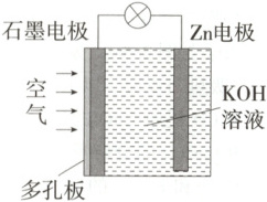 10.C 该装置为原电池,能将化学能转化为电能,A正确;该电池工作时,Zn电极为负极,通入空气的石墨电极为正极,即空气中的氧气在石墨电极上得到电子发生还原反应,B正确;原电池工作时,电子从负极流出经导线流回正极,即电子流向为Zn电极→导线→石墨电极,C错误;电解质溶液呈碱性,结合图示装置可写出正极反应式为O₂ + 4e⁻ + 2H₂O = 4OH⁻,D正确。