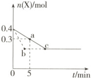 9.C a点X的物质的量比b点大,说明参与反应的X较少,则反应进行到a点时放出的热量小于反应进行到b点时放出的热量,A项错误;催化剂能加快反应速率,缩短达到平衡的时间,故实线表示无催化剂的情形,B项错误;b、c两点之后,X的物质的量不再变化,说明反应已达到相应条件下的最大限度,C项正确;反应从开始到a点,X的物质的量减小了0.1mol,浓度减小了$\frac{0.1mol}{2L}$ = 0.05mol·L⁻¹,所以v(X)=$\frac{0.05mol·L⁻¹}{5min}$ = 0.01mol·L⁻¹·min⁻¹,则v(Y)=$\frac{1}{2}$v(X)=0.005mol·L⁻¹·min⁻¹,D项错误。
