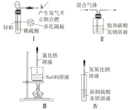 【解析】:A项,氢气点燃前需验纯,“立即点燃”未验纯,操作错误;B项,饱和碳酸钠溶液会吸收CO₂(Na₂CO₃+CO₂+H₂O=2NaHCO₃),应选饱和碳酸氢钠溶液,试剂错误;C项,制备氢氧化铁胶体需向沸水中滴加氯化铁溶液,NaOH溶液中滴加氯化铁生成沉淀,方法错误;D项,氢氧化亚铁易被氧化,未隔绝空气不能长久稳定存在,错误。